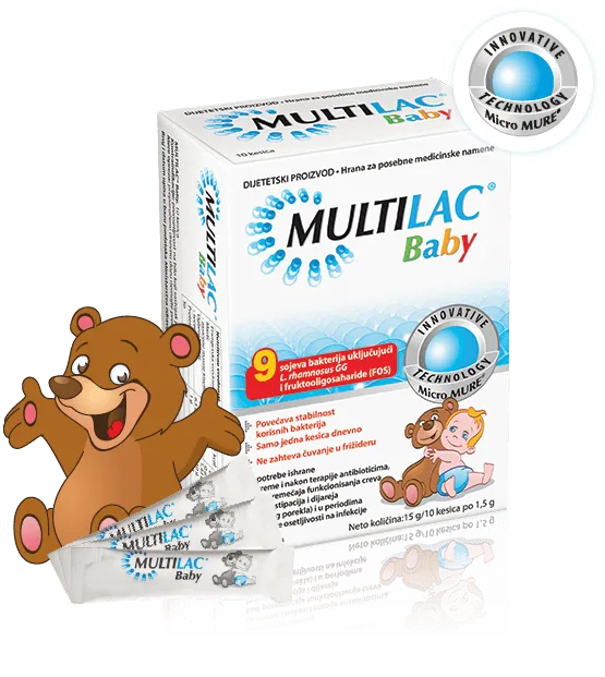MULTILAC Baby je dijetetski proizvod, hrana za posebne medicinske namene, koji sadrži 9 sojeva bakterija uključujući L. rhamnosus GG i fruktooligosaharid (FOS).